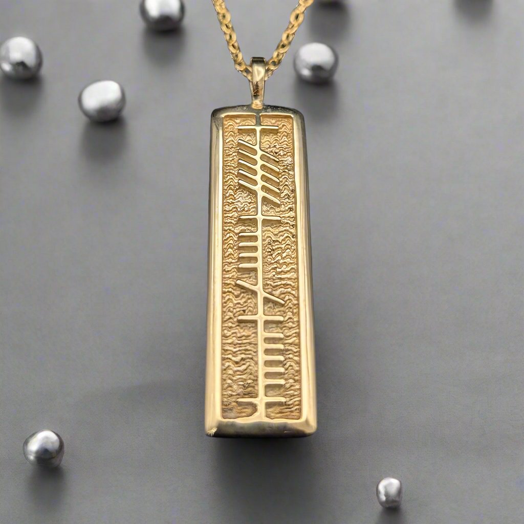 Ogham is an ancient form of Celtic writing where letters of the alphabet are represented by strokes across a centre line. This ogham pendant reads Anam cara with is the Irish expression meaning soul mate.