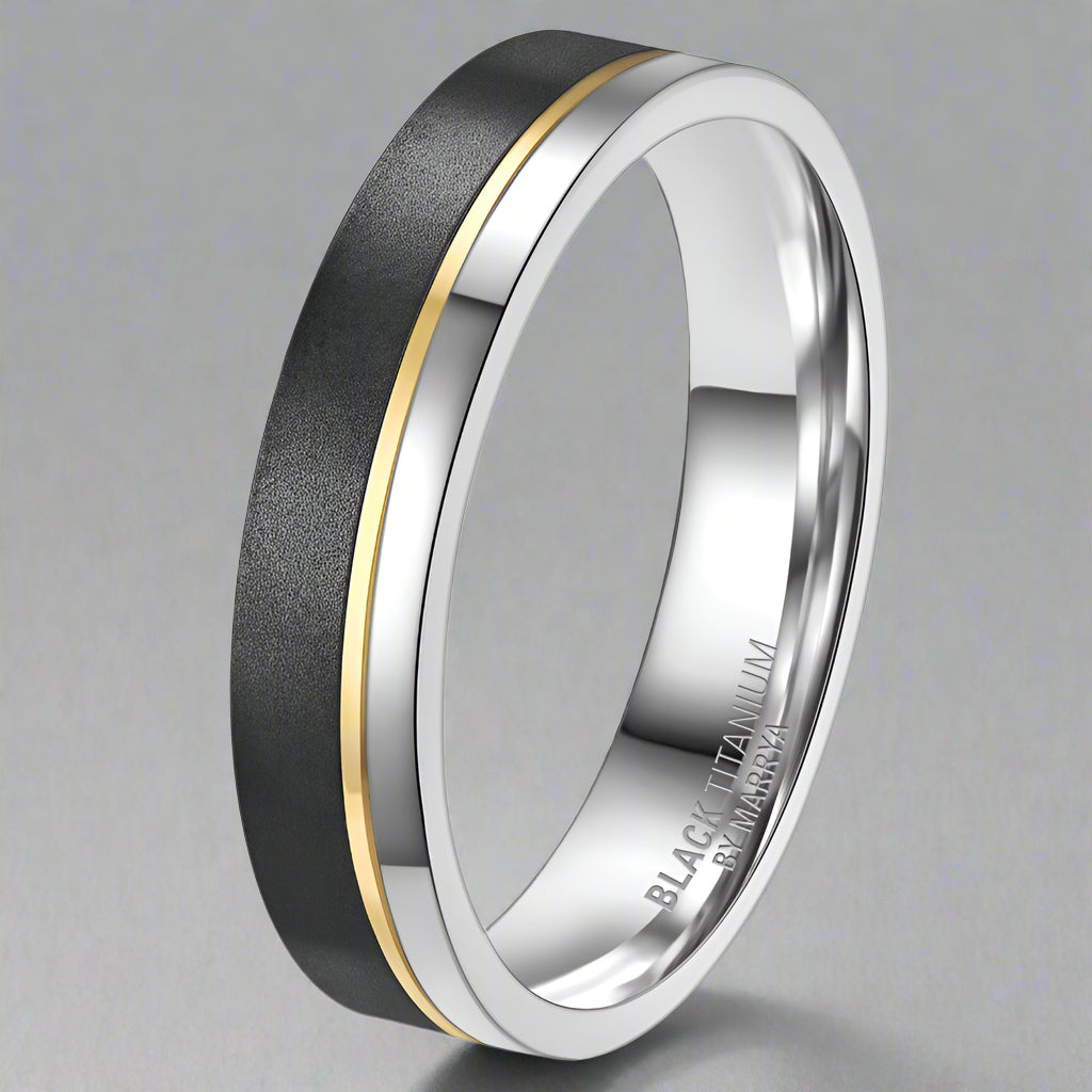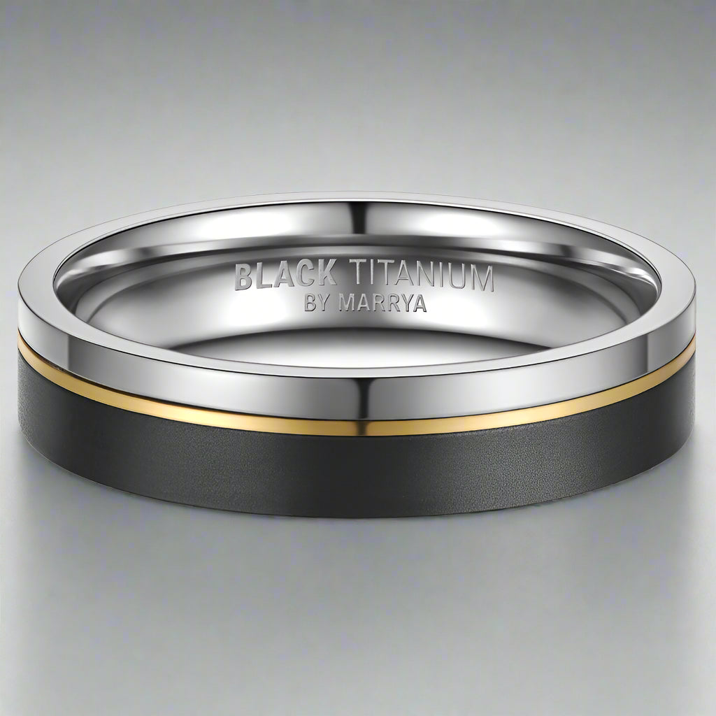This black titanium ring is expertly crafted with a modern design, featuring a luxurious 14ct yellow gold layer that adds a striking contrast.