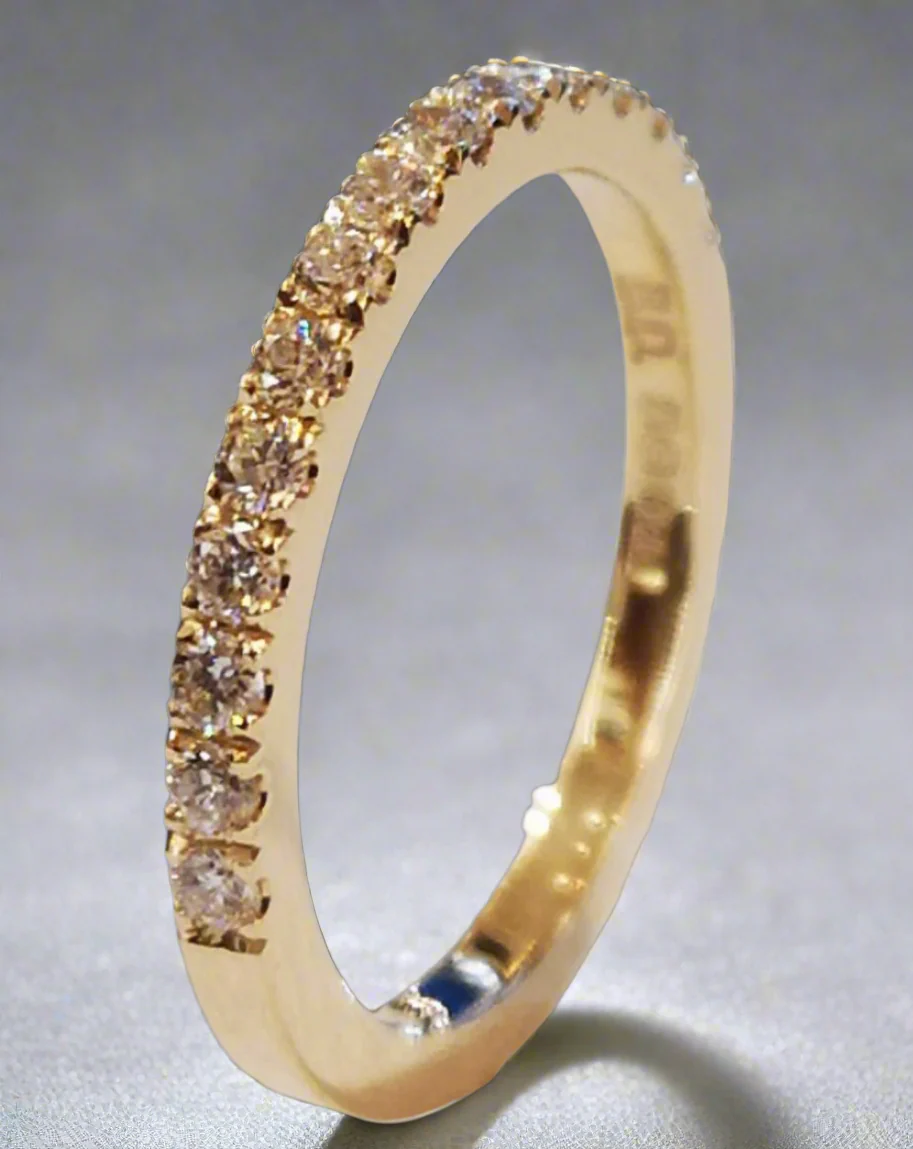 Handmade in either yellow or white gold it is set to the half finger with between 14 to 17 round brilliant lab diamonds of superior colour F and clarity VS.