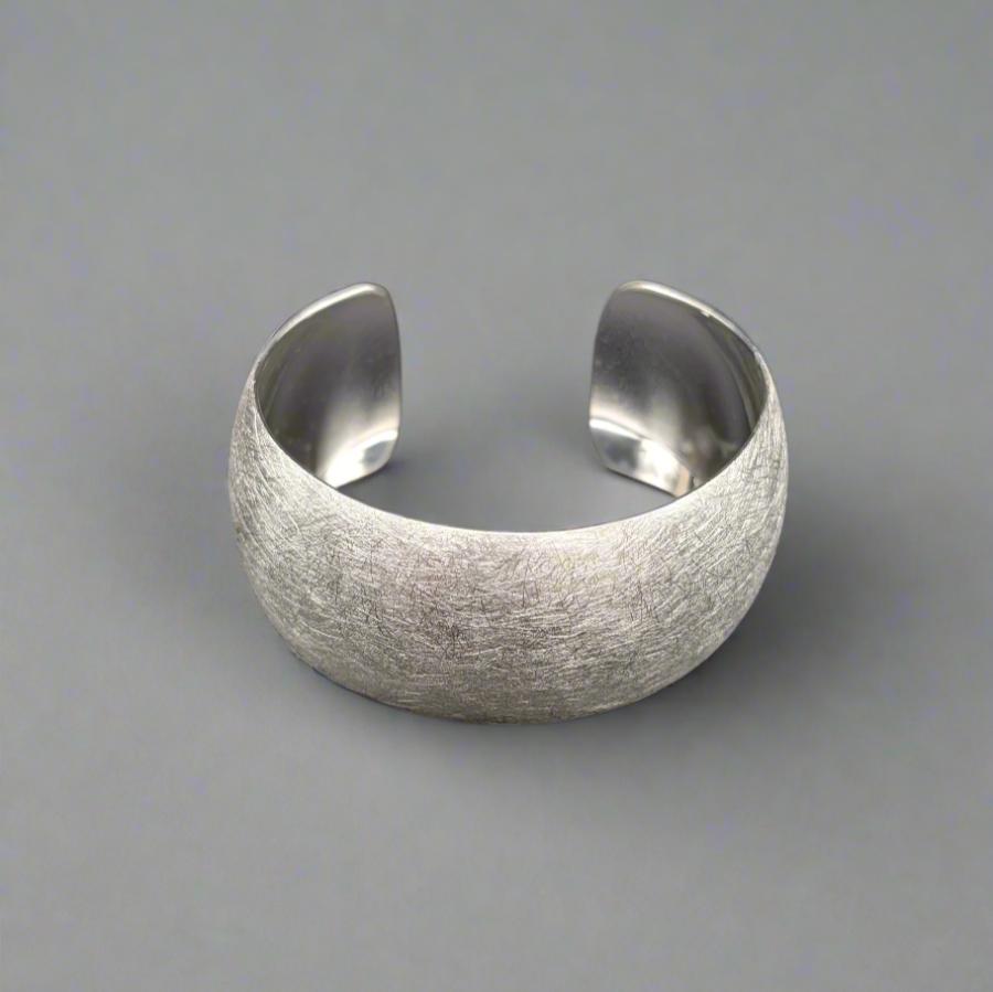 The Empress Bracelet commands attention with its bold, regal presence. Crafted from sterling silver, this wide torc bracelet features a striking scratched finish that adds texture and depth to its smooth, sculptural form. The torc design, with its open ends, wraps elegantly around the wrist, creating powerful silhouette. Its clean lines and distinctive finish evoke a sense of strength and sophistication.
