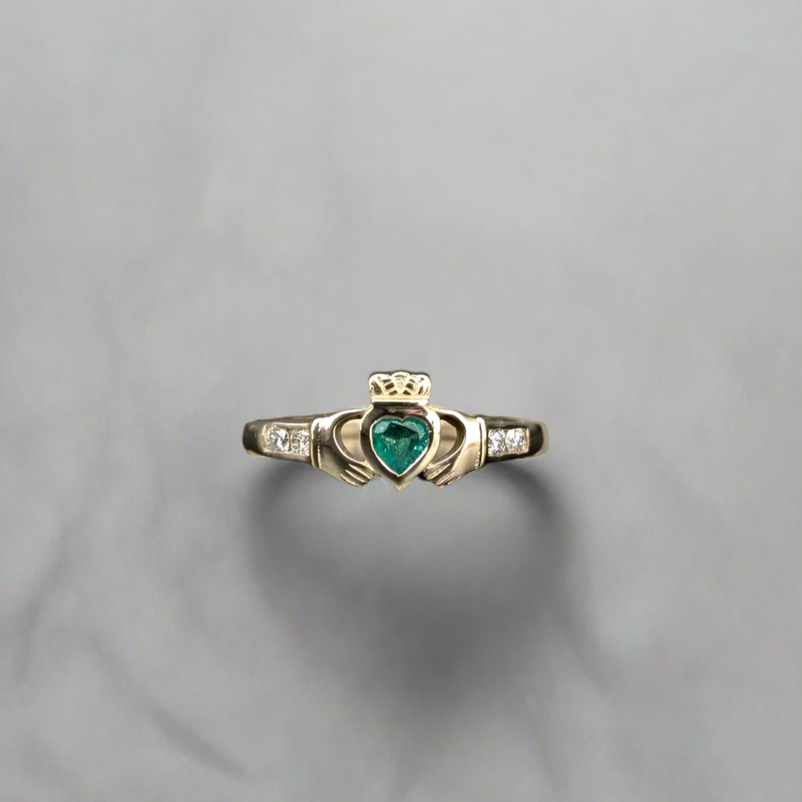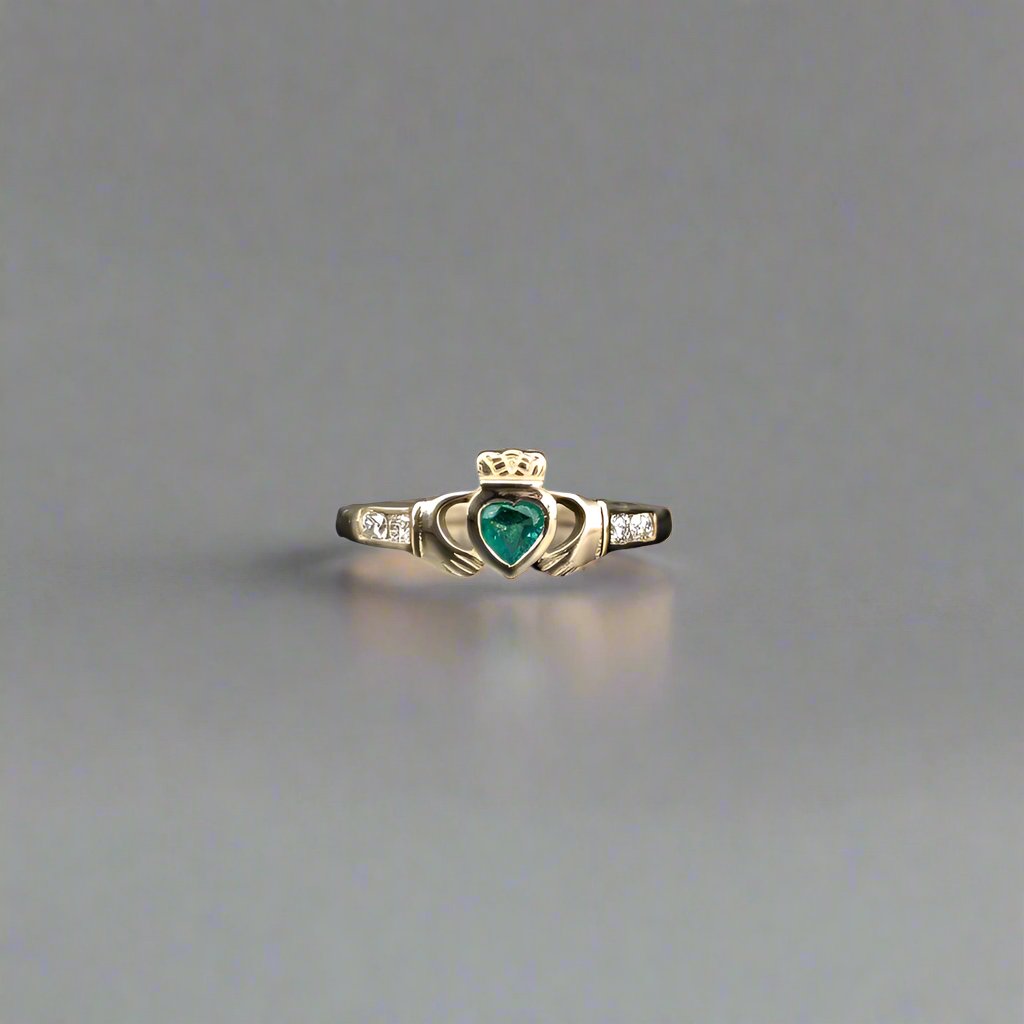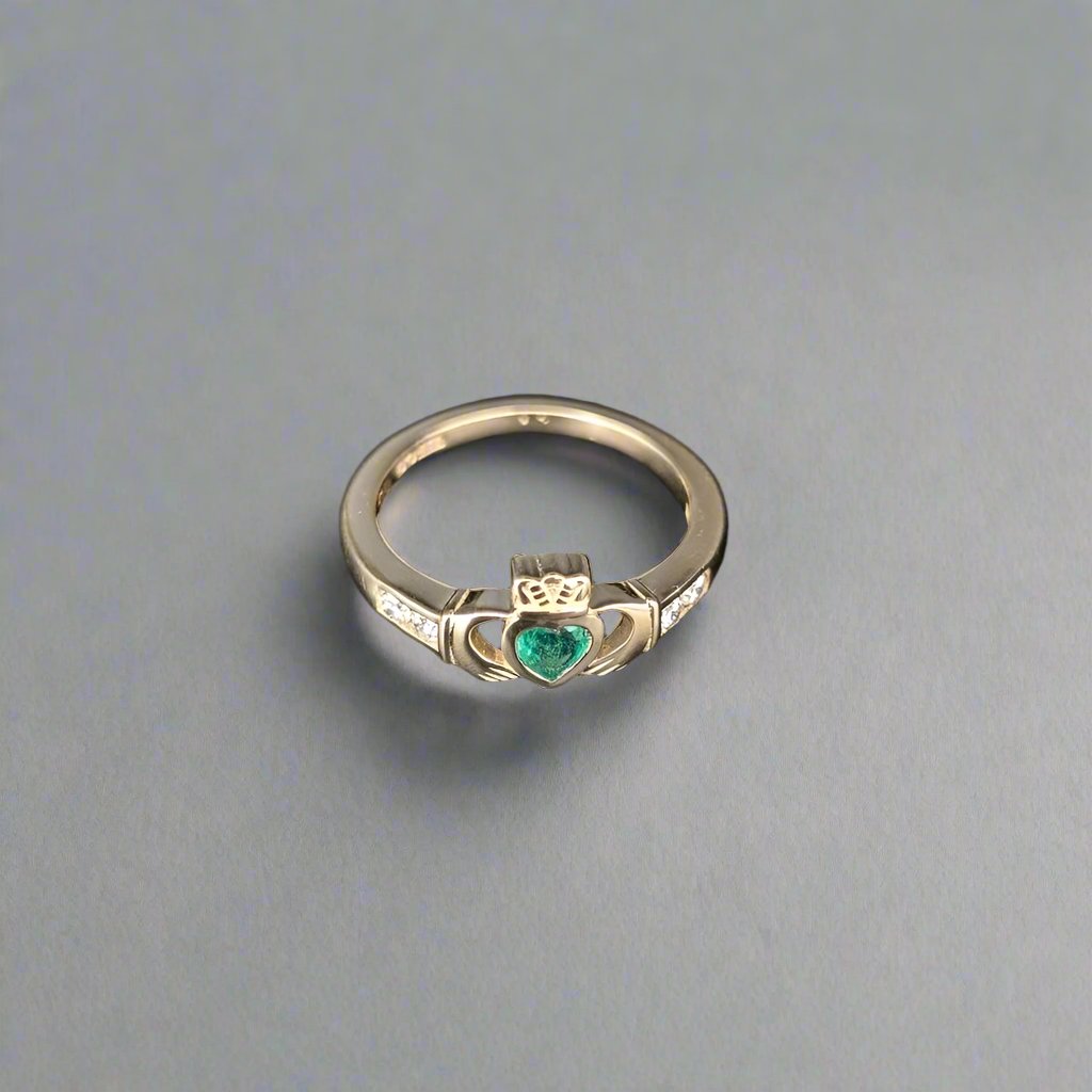 Discover the timeless elegance of our gemset Claddagh ring, a symbol of love loyalty and friendship. Crafted in our Dublin studio with meticulous attention to detail the exquisite ring features a 4mm heart shaped natural Emerald and a channel of lab grown diamonds set on each shoulder.