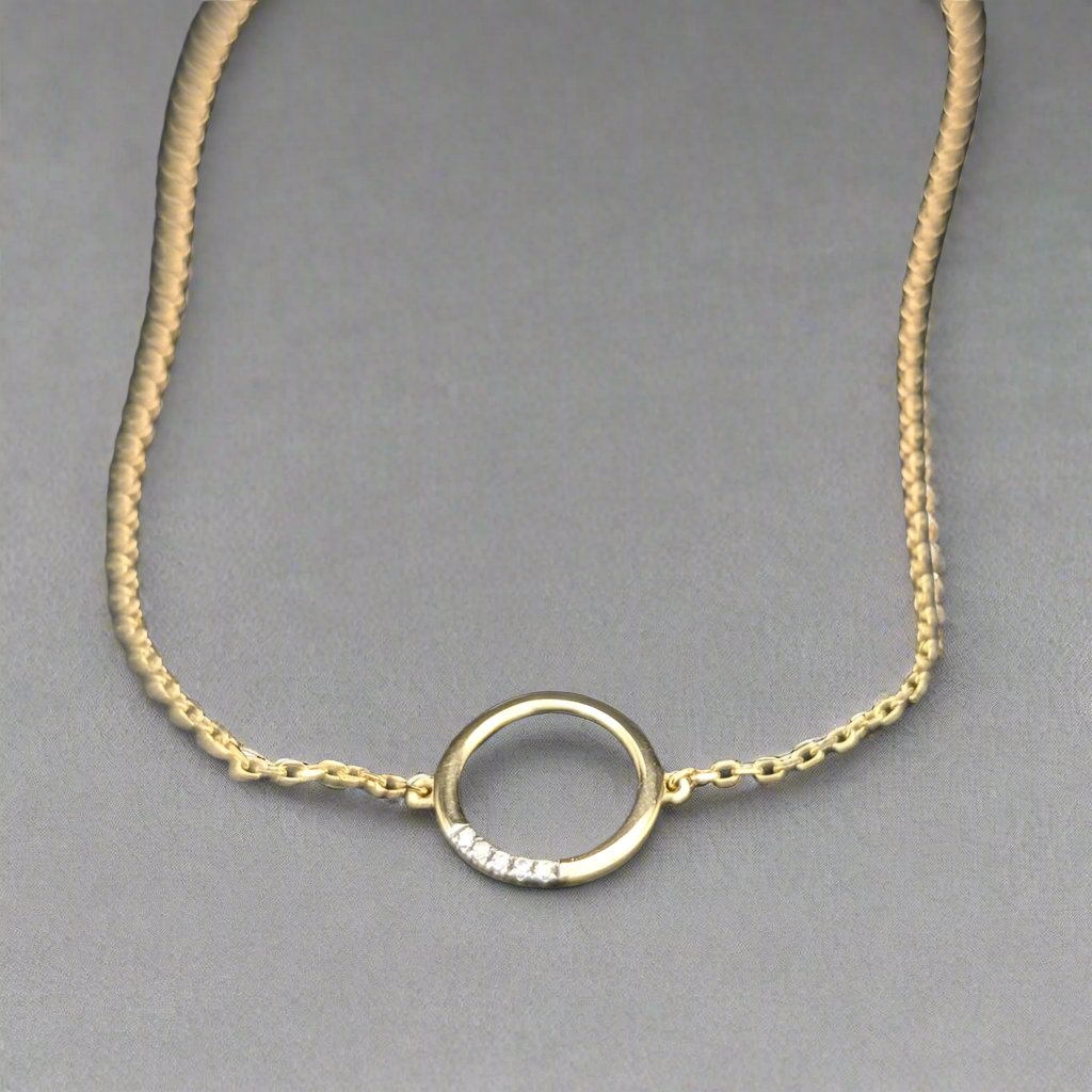 Crafted in 9ct yellow gold this bracelet features a delicate understated design that features a touch of sparkle in the circle detail. Whether worn alone for a minimalist look or layered with other pieces, this bracelet adds a touch of luxury to any look/