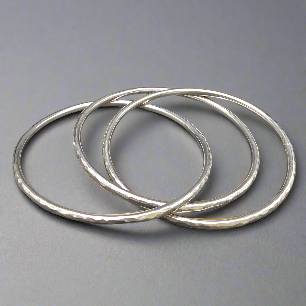 Introducing the Harmony Hammered Bangles, meticulously crafted from high-quality sterling silver, featuring a unique hammered finish that catches the light with every movement. The subtle irregularities of the hammered surface create a harmonious interplay of light and shadow.