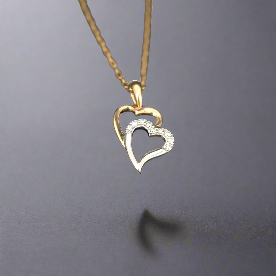 Discover the elegance of our beautiful white and yellow gold double heart pendant. This pendant is made in both 14ct white and yellow gold layered on top of each other. The white gold heart is set with sparkling natural diamonds creating a dazzling contrast with the warm yellow gold.