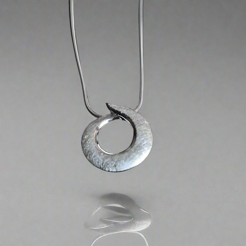Simple and delicate this scratched finished "in the round" pendant is perfect for everyday wear. It's measures only about 2cm at its widest point so it's perfect for someone that likes understated elegance. We also have made matching earrings for this piece.