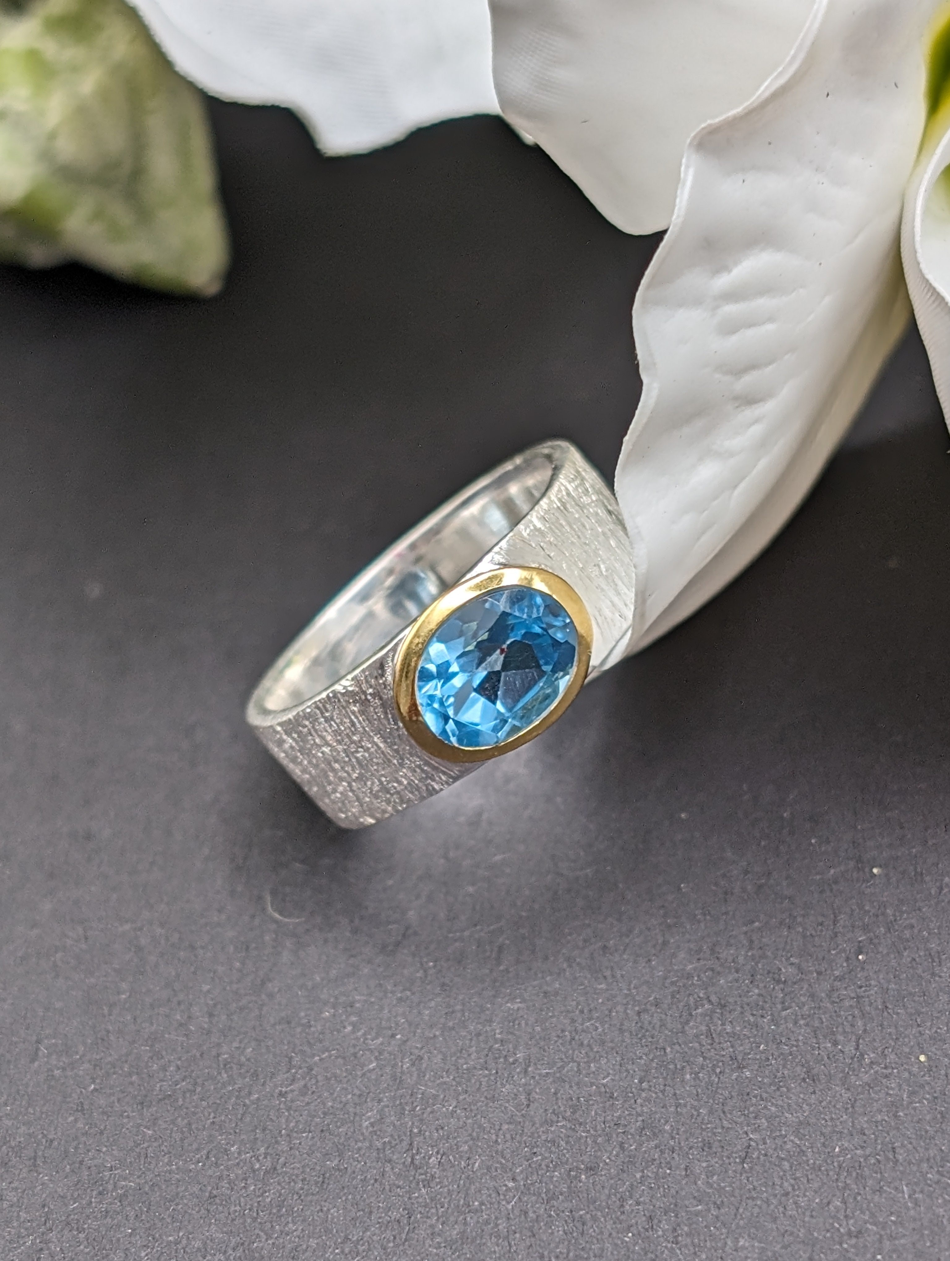 At its heart, a captivating oval gemstone is bezel set in silver with 18 CT gold vermeil detail, creating a stunning contrast that highlights the stone’s brilliance.