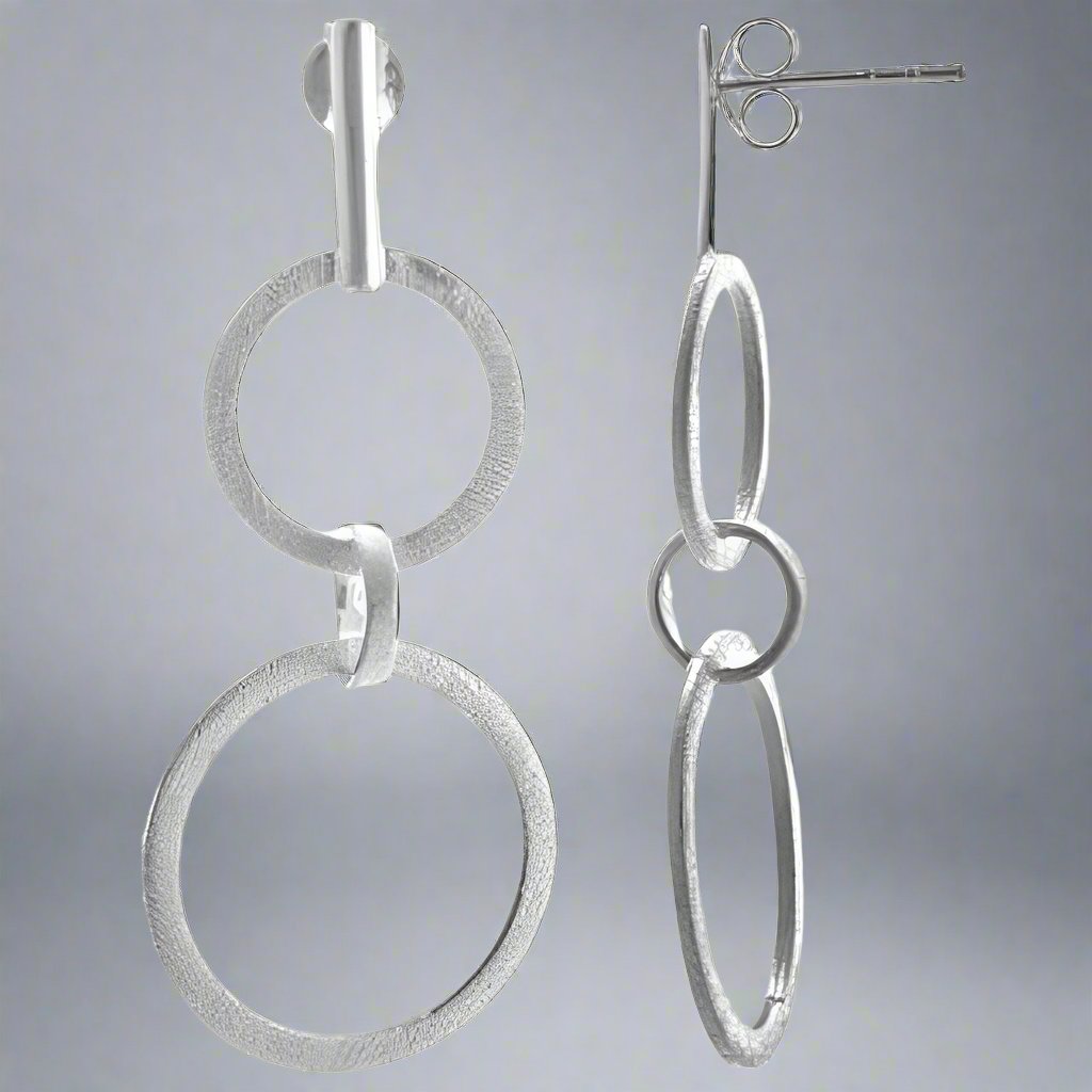 Handmade in sterling silver and finished with a random scratch effect that gives these earrings a glistening appearance when worn in the silver version.