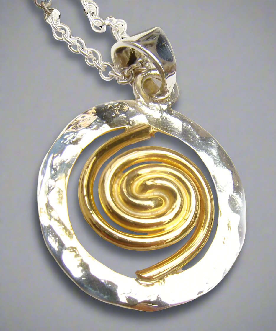 It is said that the spiral that turns clockwise represents growth whilst a spiral that turns anti-clockwise represents inner reflection. This spiral has both indicating a harmonious balance between inner and outer worlds