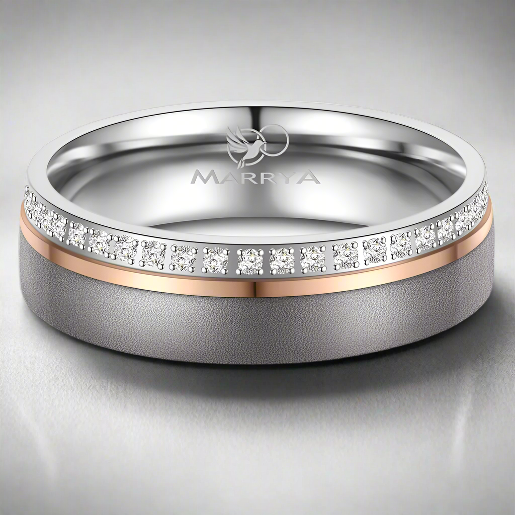The rose gold detail adds warmth and elegance, creating a contemporary yet timeless piece designed to endure daily life while symbolizing lasting commitment.