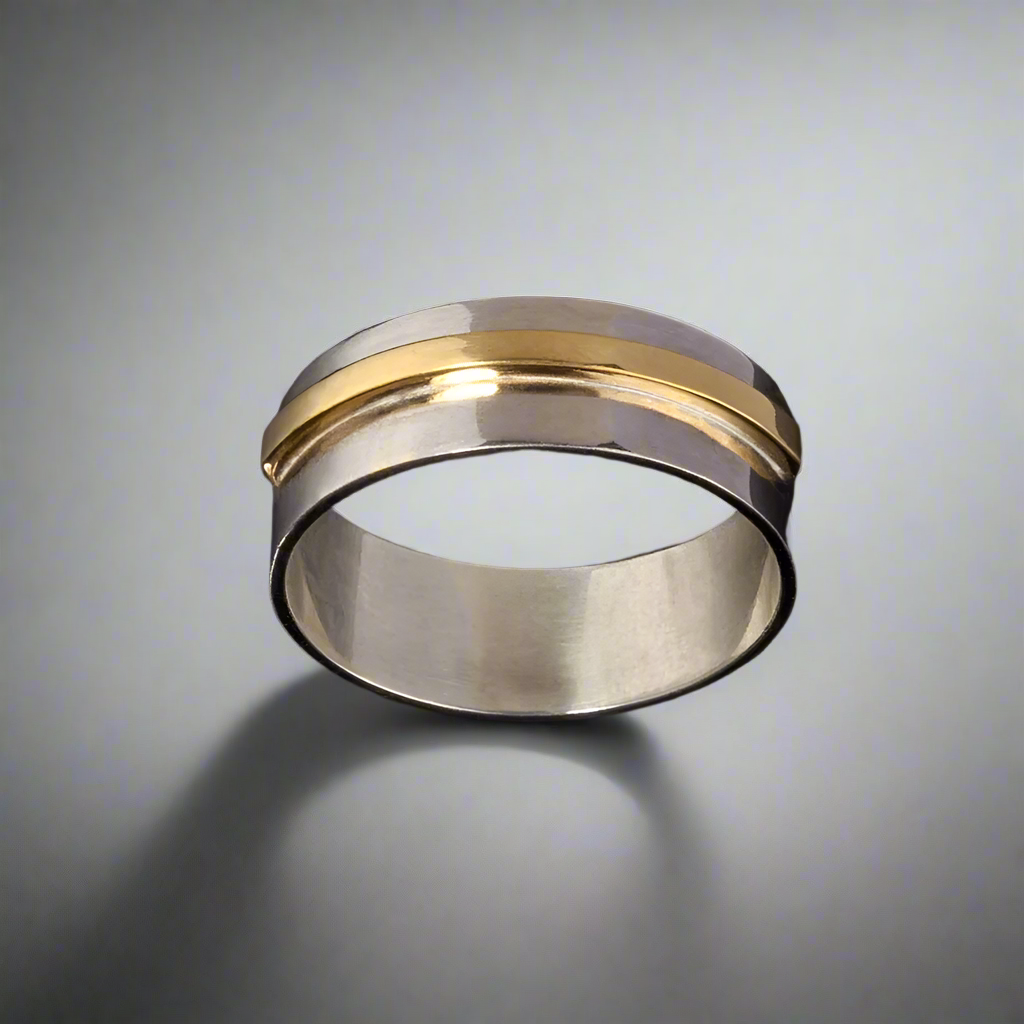 This wedding ring has very clean contemporary lines, measuring 7mm in width with a raised bar of solid gold down the centre of the ring. This ring is made to order and price below in 10ct white and yellow gold and can be made in 14ct or 18ct gold on request.