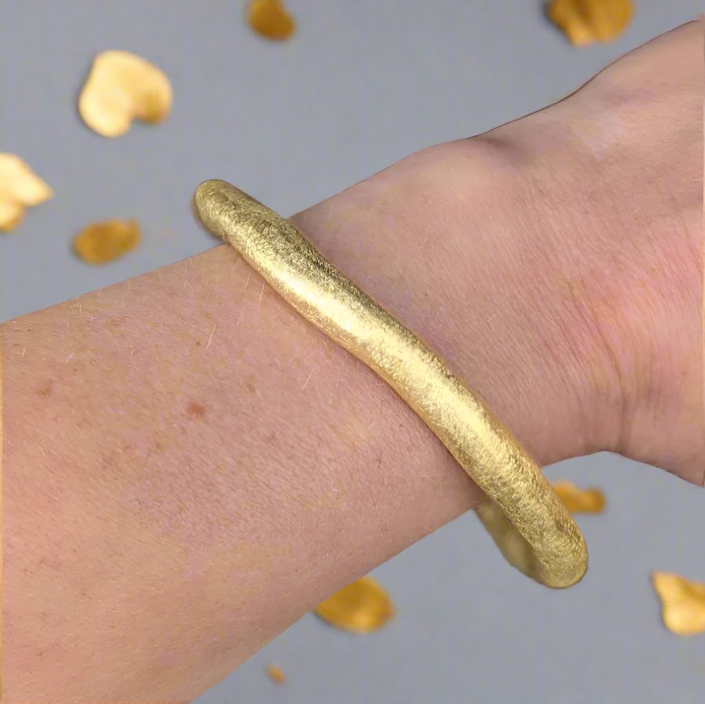 The Rustics bangle brings an artful touch of organic elegance to any wrist. With a unique scratched finish, this piece features a distinctive bumpy shape, creating a tactile surface that catches and reflects light with every movement. Its undulating texture adds an earthy, natural feel, making it a standout accessory that feels both raw and refined. Perfect for those who appreciate handcrafted, one-of-a-kind designs, this bracelet seamlessly blends modern aesthetics with a touch of rustic charm.